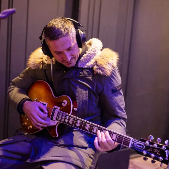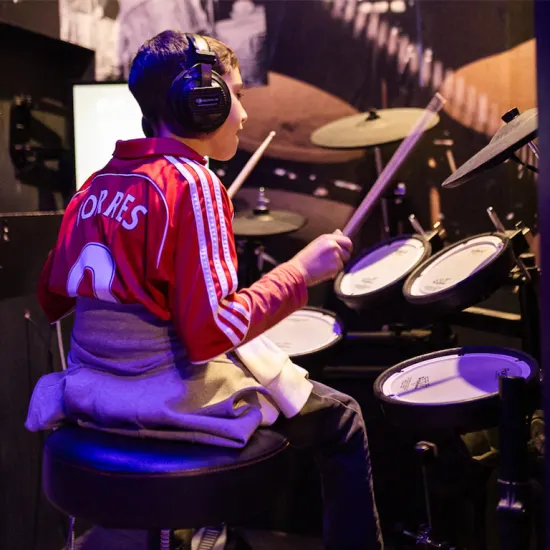 Experience the Gibson Interactive Studio to try guitar, drums, or keyboards.